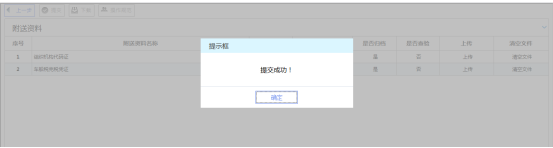 7、 附列資料逐個(gè)上傳完畢,點(diǎn)擊 “提交”按鈕,系統(tǒng)提示提交成功,申請操作全部完成。