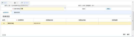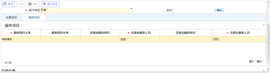 3、 在“操作類(lèi)型”中選擇變更或終止,如選擇“變更”,再點(diǎn)擊“增行”,選擇變更項(xiàng)目,填寫(xiě)必錄數(shù)據(jù)。如選擇變更服務(wù)項(xiàng)目,則需切換“服務(wù)項(xiàng)目”選項(xiàng)卡,填寫(xiě)必錄信息。