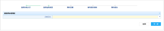 3、 點(diǎn)擊“開始預(yù)約”, 選擇行政區(qū)劃,點(diǎn)擊 “下一步”;選擇業(yè)務(wù)類型后點(diǎn)擊 “下一步”;輸入預(yù)約日期后點(diǎn)擊 “下一步”;填寫相關(guān)資料后點(diǎn)擊 “下一步”,成功預(yù)約后,在預(yù)約時(shí)間納稅人前往辦稅服務(wù)大廳,通過叫號機(jī)叫號進(jìn)行辦稅業(yè)務(wù)。