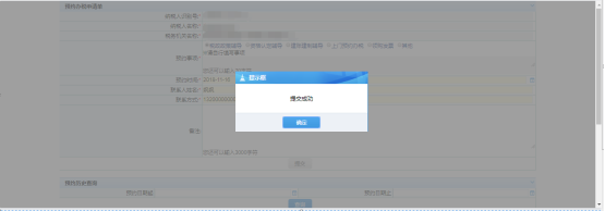 2、 選擇“預(yù)約事項(xiàng)”,“預(yù)約時(shí)間”,填寫“聯(lián)系人姓名”、“聯(lián)系方式”和“備注”點(diǎn)擊“提交”之后點(diǎn)擊確定,完成預(yù)約