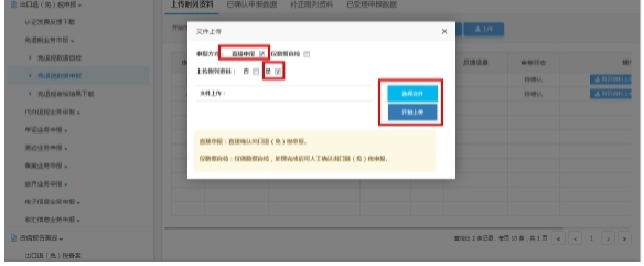 企業(yè)通過上傳附列資料頁面,點(diǎn)擊“上傳”按鈕,選擇“直接申報(bào)”,如有