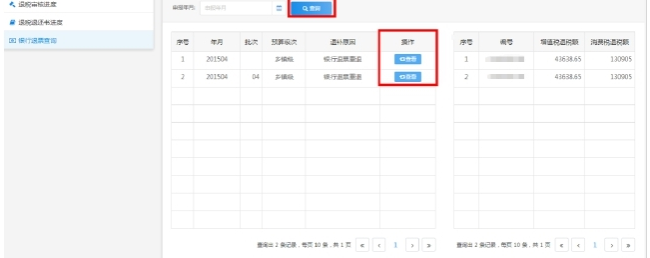 輸入“申報(bào)年月”點(diǎn)擊“查詢”按鈕,查詢相關(guān)銀行退票信息,通過“查看”