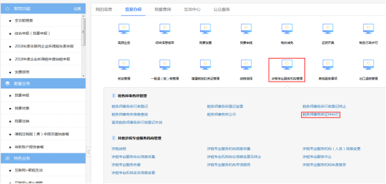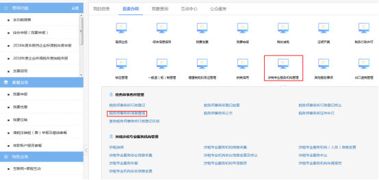 納稅人進(jìn)入涉稅專業(yè)服務(wù)機(jī)構(gòu)管理菜單頁(yè)面后,點(diǎn)擊涉稅專業(yè)服務(wù)系統(tǒng)說(shuō)明稅務(wù)師事務(wù)所證件補(bǔ)打圖標(biāo),如下圖所示: