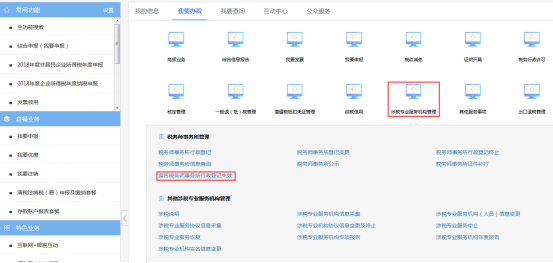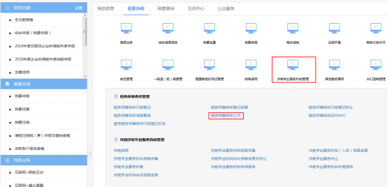納稅人進(jìn)入涉稅專業(yè)服務(wù)機(jī)構(gòu)管理菜單頁(yè)面后,點(diǎn)擊涉稅專業(yè)服務(wù)系統(tǒng)說(shuō)明稅務(wù)師事務(wù)所公示圖標(biāo),如下圖所示:
