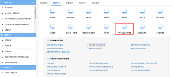 納稅人進(jìn)入涉稅專業(yè)服務(wù)機(jī)構(gòu)管理菜單頁(yè)面后,點(diǎn)擊涉稅專業(yè)服務(wù)系統(tǒng)說(shuō)明稅務(wù)師事務(wù)所登記變更圖標(biāo),如下圖所示: