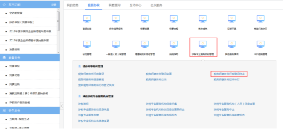 納稅人進(jìn)入涉稅專業(yè)服務(wù)機(jī)構(gòu)管理菜單頁(yè)面后,點(diǎn)擊涉稅專業(yè)服務(wù)系統(tǒng)說(shuō)明宣告稅務(wù)師事務(wù)所行政登記失效圖標(biāo),如下圖所示: