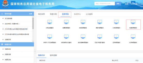 納稅人在登錄后,通過首頁(yè)【我要查詢】——【優(yōu)惠信息查詢】進(jìn)入。