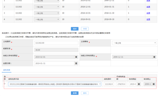 4、點擊維護應(yīng)稅信息,可以對土地信息進行完善,增加減免信息等,還可以對土地信息進行變更,界面如下: