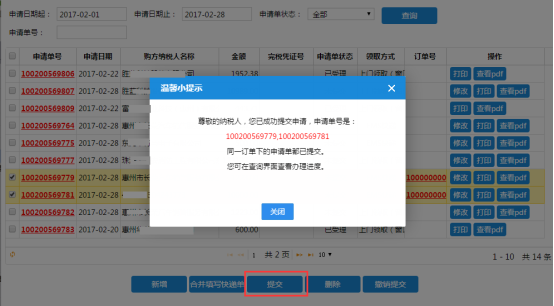 填寫完成后,勾選記錄進行提交。如果只勾選了其中的一個申請單提交,系統(tǒng)會自動將同一個訂單中的其他申請單一起提交。