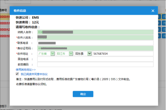 注意:收件地址限制了納稅人所屬地市內,不能跨市收件。