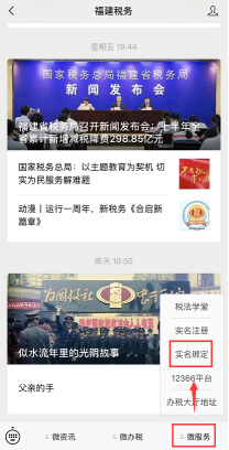 ? 進入“福建稅務(wù)”微信公眾號,如尚未關(guān)注微信公眾號或尚未辦理實名注冊用戶,請參考本文檔2.1章節(jié)進行操作;已完成上述操作步驟用戶選擇【微服務(wù)】-【實名綁定】菜單。