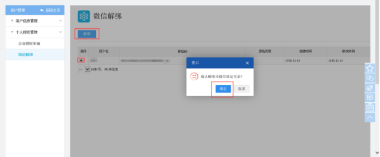 ? 在【微信解綁】頁面,選擇需要解除綁定關(guān)系的用戶信息,點擊【解綁】,提示確認(rèn)解綁該微信微信綁定關(guān)系,點擊確定則解除綁定關(guān)系,點擊取消則不解除綁定關(guān)系;解除微信綁定關(guān)系后,則無法使用微信掃碼登錄功能。