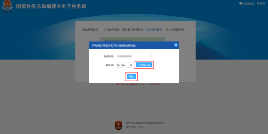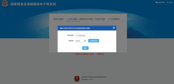 ? 根據(jù)提示,輸入當(dāng)前辦稅人員手機號碼,點擊【獲取驗證碼】,輸入收到的驗證碼后點擊【確定】。