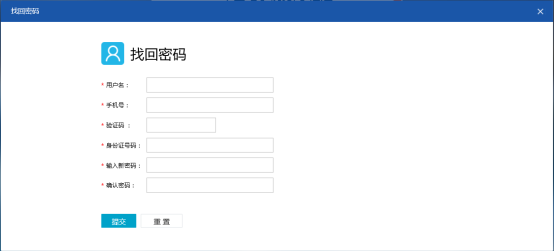? 在登錄界面點擊【找回密碼】,出現(xiàn)找回密碼界面,輸入用戶名、手機號、驗證碼、輸入新密碼和確認(rèn)密碼,點擊【提交】即可。