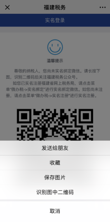 ? 未關(guān)注“福建稅務(wù)”微信公眾號用戶,需先根據(jù)提示,關(guān)注“福建稅務(wù)”微信公眾號。長按頁面二維碼圖片,點擊【識別圖中二維碼】,完成關(guān)注。