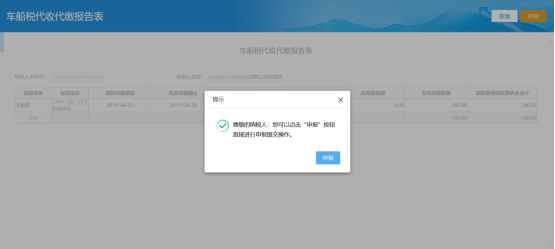? 進入車船稅代收代繳報告表提交頁面,核對申報數(shù)據(jù),確認無誤的點擊【申報】。