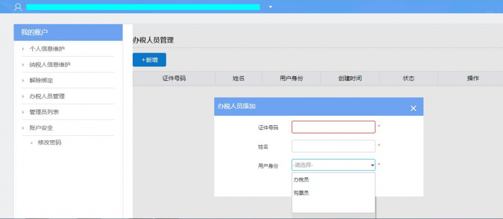 1、實(shí)名登錄選擇企業(yè)身份,進(jìn)入我的賬戶—>辦稅人員管理,選擇對(duì)應(yīng)信息進(jìn)行新增操作。