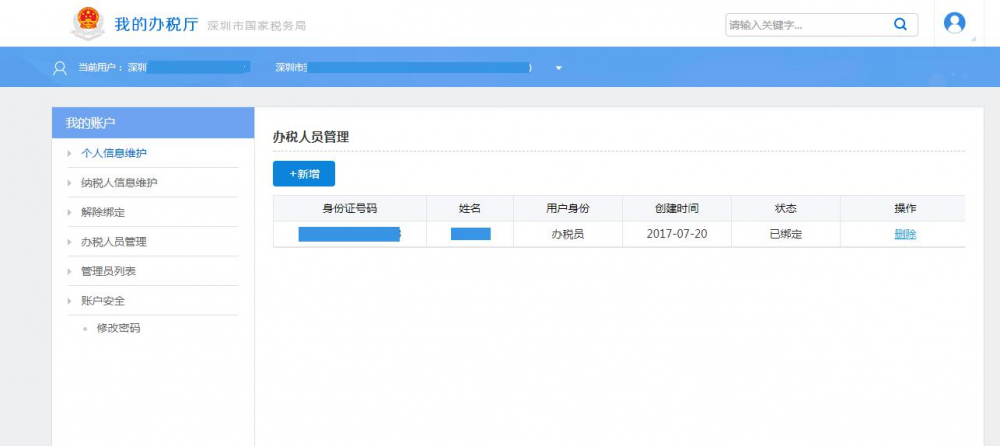 2、實(shí)名登錄選擇企業(yè)身份,進(jìn)入我的賬戶—>辦稅人員管理,選擇對(duì)應(yīng)信息進(jìn)行刪除操作。