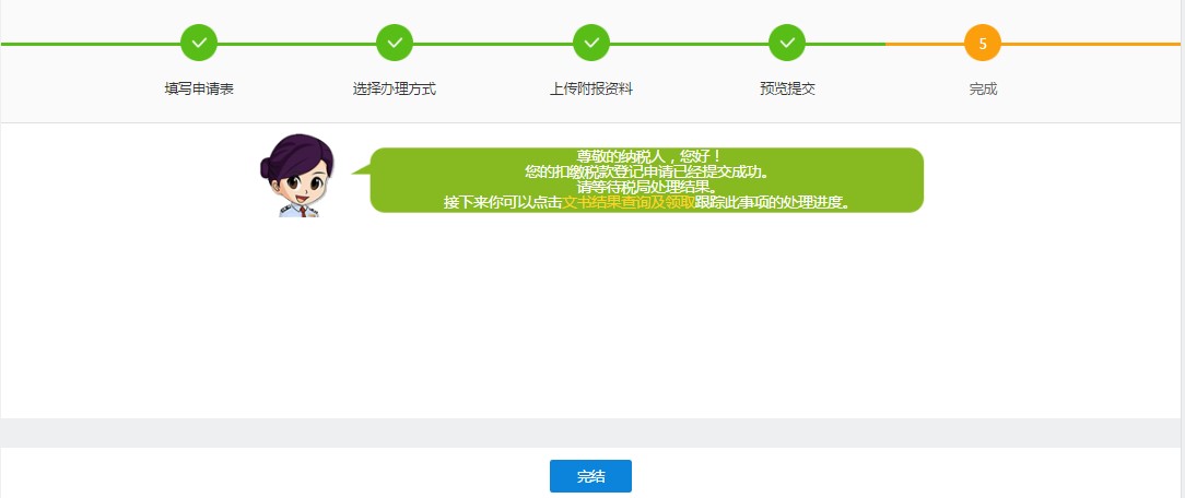 點擊【完結】按鈕,關閉該界面。提交的申請表可在首頁【文書結果查詢及領取】模塊進行查詢、打印。