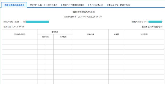 (3)申報(bào)表分為“酒類消費(fèi)稅納稅申報(bào)表”“本期準(zhǔn)予抵減(扣)稅額計(jì)算表”“本期代收代繳稅額計(jì)算表”“生產(chǎn)經(jīng)營(yíng)情況表”“本期減(免)稅額明細(xì)表”五個(gè)部分。