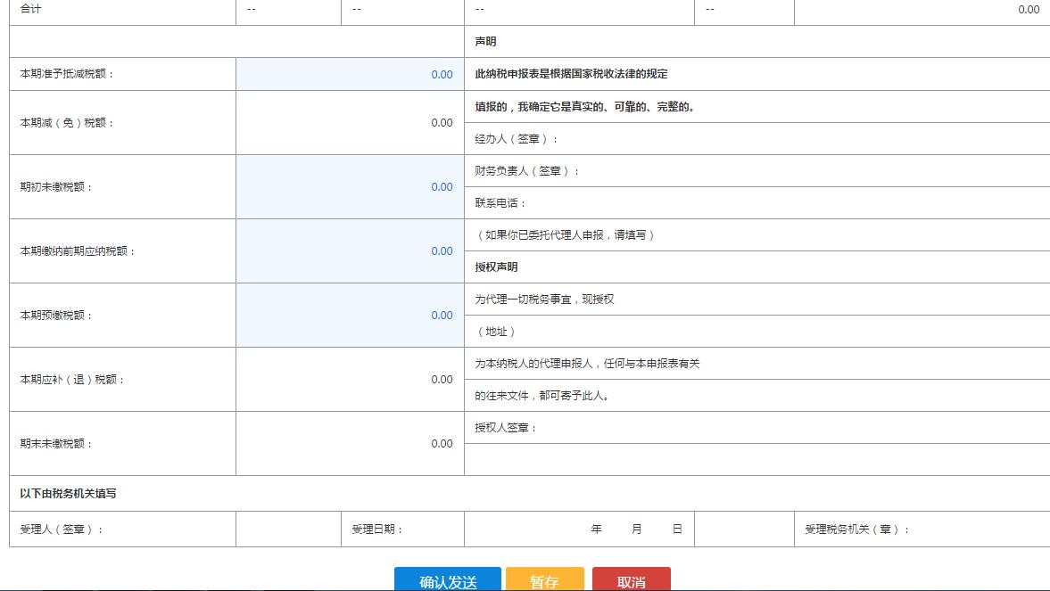 手動(dòng)填入本期準(zhǔn)予抵扣稅額、期初未繳稅額,本期繳納前期應(yīng)納稅額、本期預(yù)繳稅額,本期應(yīng)補(bǔ)(退)稅額和本期減(免)稅額自動(dòng)計(jì)算出。