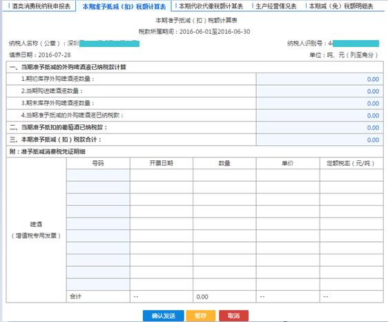 手動(dòng)輸入期初庫(kù)存外購(gòu)啤酒液數(shù)量、期初庫(kù)存外購(gòu)啤酒液數(shù)量、期末庫(kù)存外購(gòu)啤酒液數(shù)量、當(dāng)期準(zhǔn)予抵減的外購(gòu)啤酒液已納稅款、當(dāng)期準(zhǔn)予抵扣的葡萄酒已納稅款、本期準(zhǔn)予抵減(扣)稅款合計(jì),手動(dòng)輸入啤酒(增值稅專用發(fā)票)。