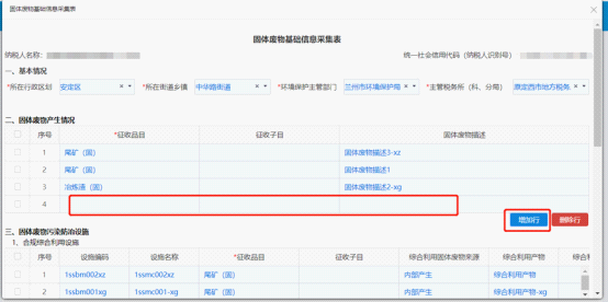 (2)固體廢物基礎(chǔ)信息新增操作:點(diǎn)擊需要新增模塊的新增按鈕,在新增行輸入新增信息即可