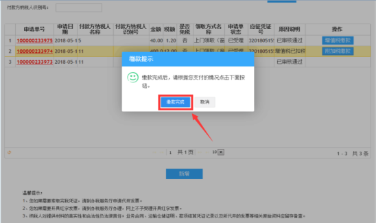 ?          稅款劃繳成功后,返回自然人發(fā)票代開頁面,頁面上會出現(xiàn)繳款提示,點擊【繳款完成】即可完成劃繳操作。