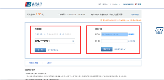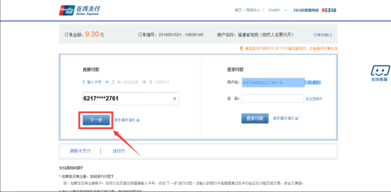 ?          選擇【直接付款】方式,輸入對應(yīng)銀行卡賬號后,點擊【下一步】,頁面會跳轉(zhuǎn)付款信息確認頁面。