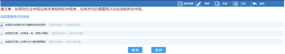5、點擊頁面右上方的【修改】,即可跳轉(zhuǎn)至修改頁面,展示提交了的申報表,點擊選 中申報表,再點擊頁面下方【修改】按鈕即可修改申報表信息。