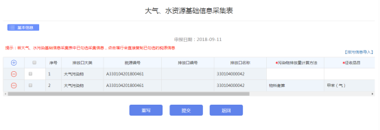4、根據(jù)業(yè)務(wù)需要維護附表【大氣、水污染采集表】,點擊【提交】。