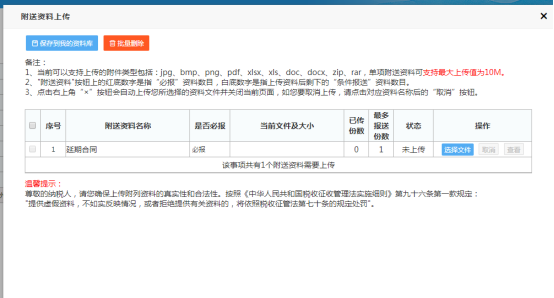 ? 點擊“附送資料”可查看并上傳所需的附送資料,其中顯示“必報”的必 須上傳,“條件報送”的可自行選擇是否上傳,點擊選擇文件,進(jìn)行上傳。