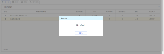 6、 附列資料逐個(gè)上傳完畢,點(diǎn)擊【提交】按鈕,系統(tǒng)將提示提交成功,該申請(qǐng)?zhí)峤坏蕉悇?wù)機(jī)關(guān)系統(tǒng)中,申請(qǐng)操作全部完成。