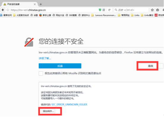 1、打開網(wǎng)站時出現(xiàn)如下警告信息,此時需選擇“高級”,然后點擊“添加例外”按鈕。
