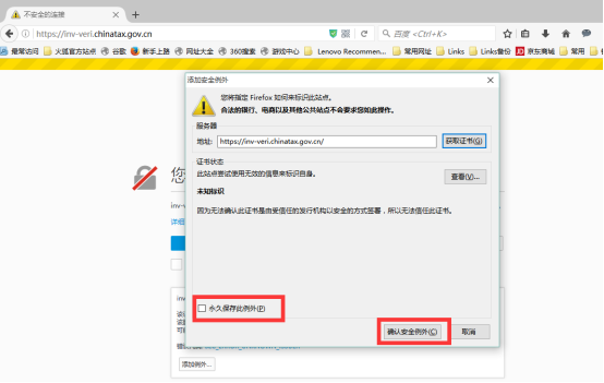 2、建議將“永久保存此例外”的選項置為未勾選狀態(tài),然后點擊“確認安全例外”按鈕。