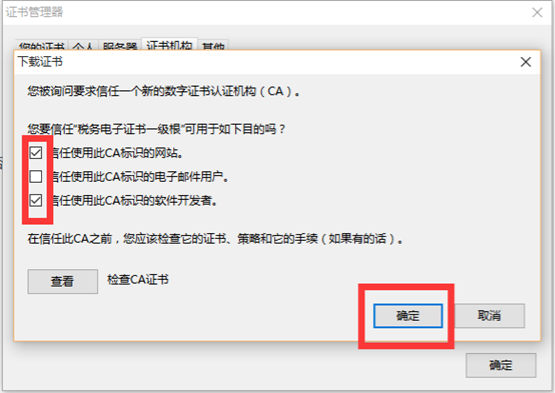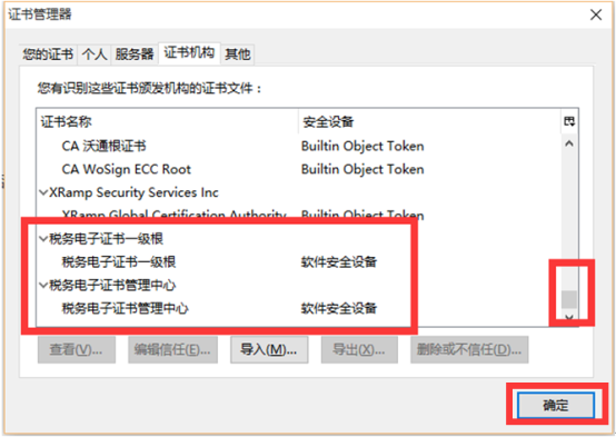 12、此時在證書機構選項卡的證書列表最后可以看到出現(xiàn)下圖所示的稅務電子證書條目即可,此時點擊“確定”即可完成根證書的安裝工作。