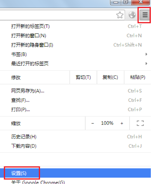 5、點(diǎn)擊谷歌瀏覽器右上角的設(shè)置快捷按鈕,然后點(diǎn)擊設(shè)置子菜單