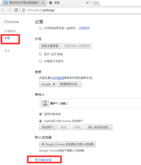 6、拖動(dòng)瀏覽器右側(cè)的垂直滾動(dòng)條到最底端,然后點(diǎn)擊”顯示高級(jí)設(shè)置“