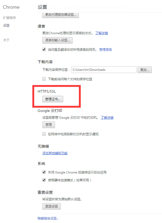 7、拖動(dòng)瀏覽器右側(cè)的垂直滾動(dòng)條到最底端,然后點(diǎn)擊”管理證書(shū)“按鈕