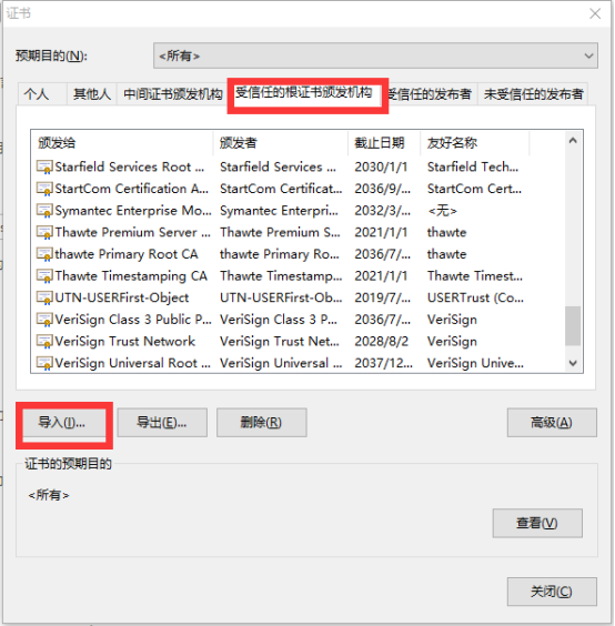 8、選擇”受信任的根證書(shū)頒發(fā)機(jī)構(gòu)“,然后點(diǎn)擊”導(dǎo)入“按鈕
