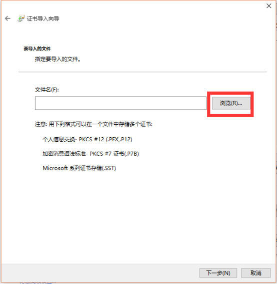 10、在彈出的對(duì)話框中點(diǎn)擊“瀏覽”按鈕,然后選擇下載證書(shū)的文件夾。先選擇右下方的證書(shū)文件類(lèi)型為PKCS#7證書(shū),然后選擇下載的根證書(shū)文件名,最后點(diǎn)擊”打開(kāi)“按鈕。