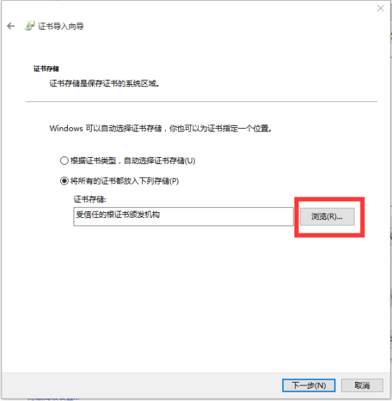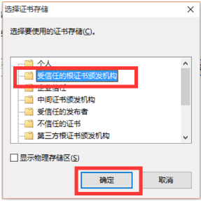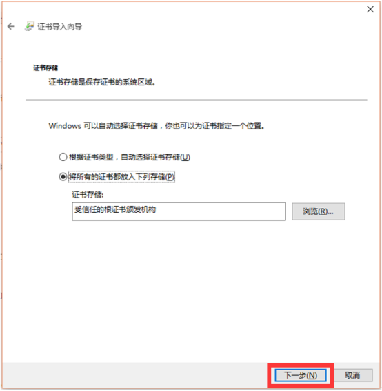 12、選擇 “瀏覽”按鈕,在彈出的對(duì)話框中選擇“受信任的根證書(shū)頒發(fā)機(jī)構(gòu)”,點(diǎn)擊“確定”按鈕,最后點(diǎn)擊“下一步”按鈕: