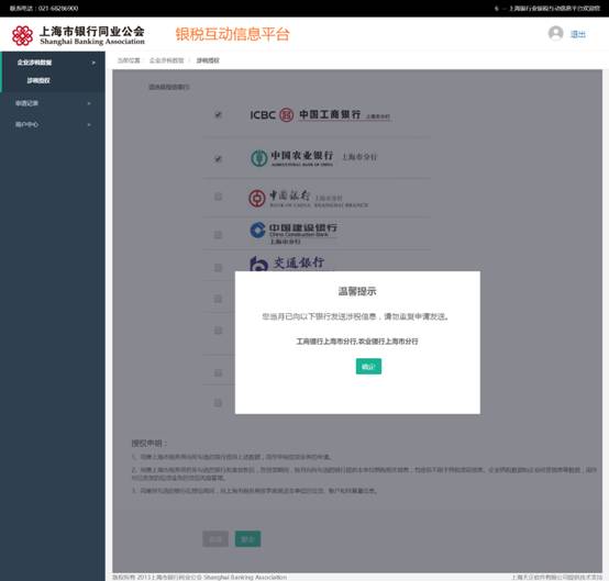 4.用戶根據(jù)系統(tǒng)提示返回上海市銀行同業(yè)公會銀稅互動信息平臺。