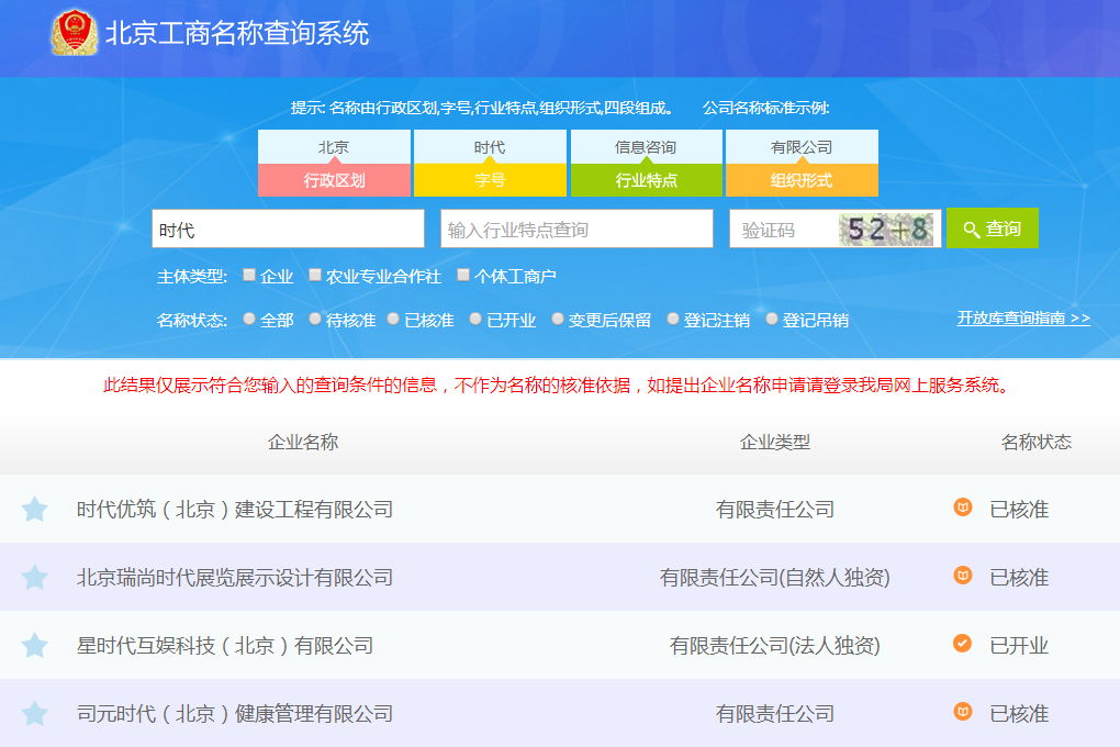 例如:在字號(hào)查詢搜索欄中輸入“時(shí)代”,點(diǎn)擊查詢,系統(tǒng)展現(xiàn)所有字號(hào)包含“時(shí)代”的名稱,如下圖所示: