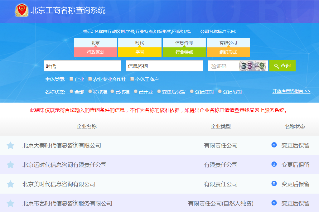 例如:繼續(xù)在行業(yè)特點(diǎn)搜索欄中輸入“信息咨詢”,點(diǎn)擊查詢,系統(tǒng)展現(xiàn)所有字號(hào)包含“時(shí)代”、行業(yè)特點(diǎn)包含“信息咨詢”的名稱,如下圖所示: