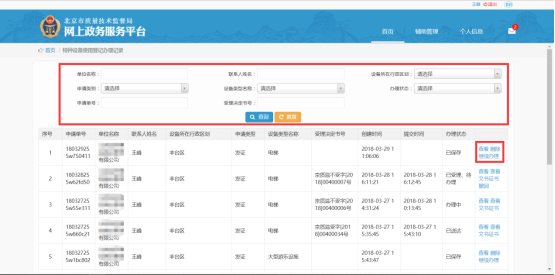當(dāng)信息比較多時(shí),用戶可以通過“單位名稱”、“聯(lián)系人姓名”、“設(shè)備所在行政區(qū)劃”、“申請(qǐng)類別”、“設(shè)備類型名稱”、“辦理狀態(tài)”、“申請(qǐng)單號(hào)”、“受理決定書號(hào)”來進(jìn)行精確查詢。如果信息輸入錯(cuò)誤,用戶可以點(diǎn)擊“重置”按鈕進(jìn)行重新輸入。