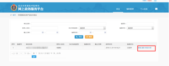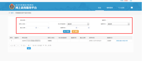 進(jìn)入“辦理記錄”界面可以根據(jù)“單位名稱”、“聯(lián)系人姓名”、“備案號”、“備案狀態(tài)”、“執(zhí)行標(biāo)準(zhǔn)時(shí)間”、“截止日期”、“備案時(shí)間”多個(gè)條件進(jìn)行精確查詢。