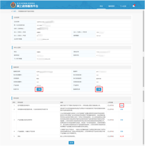 用戶點(diǎn)擊“查看”后進(jìn)入詳細(xì)信息界面。在備案信息中用戶可以下載“標(biāo)準(zhǔn)文本”和“備案報(bào)告表”。在材料信息中用戶可以查看申辦上傳時(shí)的材料文件。如下圖所示: