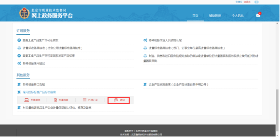 用戶點(diǎn)擊“采用國際標(biāo)準(zhǔn)產(chǎn)品標(biāo)志備案”中的“咨詢”按鈕,界面跳轉(zhuǎn)至“北京市質(zhì)量技術(shù)監(jiān)督局”官網(wǎng)中“網(wǎng)上咨詢”相關(guān)業(yè)務(wù)界面。
