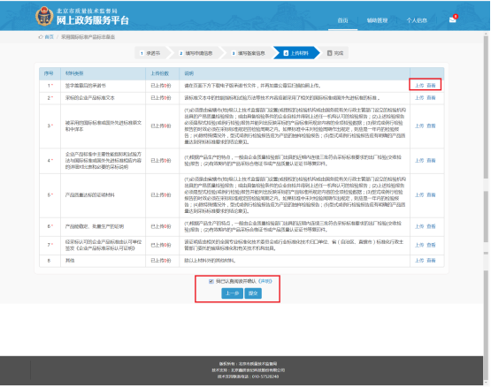 如果在“填寫備案信息”中,用戶選擇“企業(yè)標(biāo)準(zhǔn)”則上傳材料的內(nèi)容有:“簽字蓋章后的承諾書”、“采標(biāo)的企業(yè)產(chǎn)品標(biāo)準(zhǔn)文本”、“被采用的國際標(biāo)準(zhǔn)或國外先進(jìn)標(biāo)準(zhǔn)原文和中譯本”、“企業(yè)產(chǎn)品標(biāo)準(zhǔn)中主要性能指標(biāo)和試驗(yàn)方法與國際標(biāo)準(zhǔn)或國外先進(jìn)標(biāo)準(zhǔn)相應(yīng)內(nèi)容的詳細(xì)對比表和必要的采標(biāo)說明”、“產(chǎn)品質(zhì)量達(dá)標(biāo)的證明材料”、“產(chǎn)品能穩(wěn)定、批量生產(chǎn)的證明”、“經(jīng)采標(biāo)認(rèn)可的企業(yè)產(chǎn)品標(biāo)準(zhǔn)由認(rèn)可單位簽發(fā)《企業(yè)產(chǎn)品標(biāo)準(zhǔn)采標(biāo)認(rèn)可證明》”、“其他”。其中帶“*”為必填項(xiàng)。